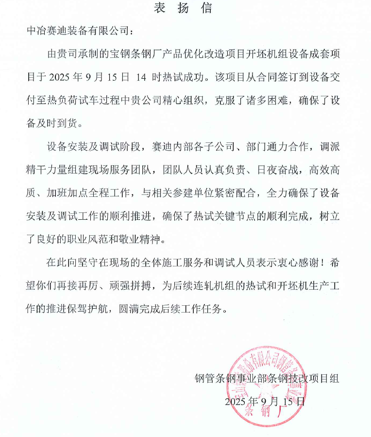 2025年9月15日,中冶賽迪裝備收到來自寶鋼股份鋼管條鋼事業(yè)部條鋼技改項目組的表揚信,對公司在寶鋼條鋼廠產品優(yōu)化改造項目開坯機組設備成套項目中的出色表現(xiàn)和重要貢獻予以充分肯定和贊揚。